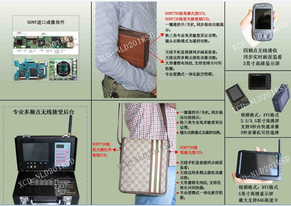 雙鏡頭設計、夜視功能強大、遙控切換鏡頭,具備無線同步遠距離傳輸功能,采用包內錄像機和無線傳輸接收終端同步視頻記錄, 雙備份保存所拍攝視頻,安全可靠;并且帶手機同步無線畫面監看功能,手機無線監視器屏幕大小為3.0英寸,方便實用。