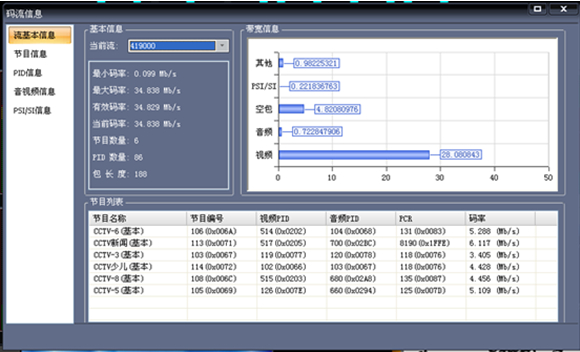 圖形化顯示PCR精度、PCR抖動、PCR頻率偏置、PCR漂移;實時顯示PID的帶寬、總帶寬、有效帶寬、帶寬溢出; PSI/SI樹狀結構實時解析;PAT、PMT、NIT、SDT表格等;