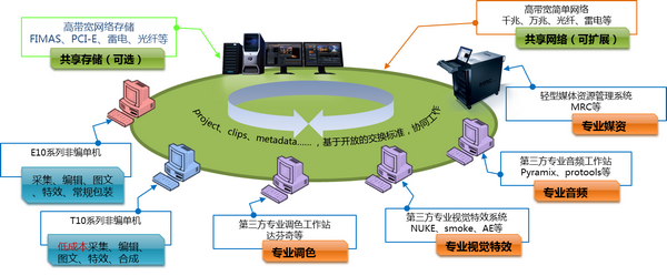 輕松聯(lián)網(wǎng),全向兼容,由單機(jī)直接組建小型離散工作組,無縫聯(lián)通第三方主流后期制作單元;全新資源管理器,靈活的移動(dòng)庫、本地庫、網(wǎng)絡(luò)庫(中心庫和自發(fā)現(xiàn)庫)資源管理;離散互聯(lián),按需共享(單機(jī)互聯(lián)、移動(dòng)交換、中央存儲(chǔ)……)。
