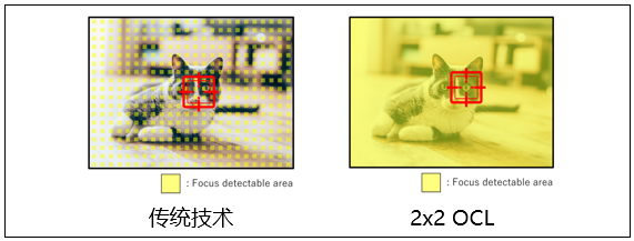 傳統的使用專用像素檢測相位差的方式,由于這些專用像素本身沒有拍照的功能,所以僅可以將部分少量的像素用作相位差檢測。而2x2 OCL的方式,拍照用的像素也可以做相位差檢測,即所有像素都可以做相位差檢測。因此,對于較小的被攝體都可以進行較高精度的對焦。
