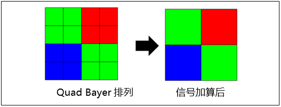 通過采用相鄰4個像素使用相同顏色的Color Filter的Quad Bayer結構, 滿足高分辨率和高感度的需求,且支持高動態范圍(HDR)拍照。