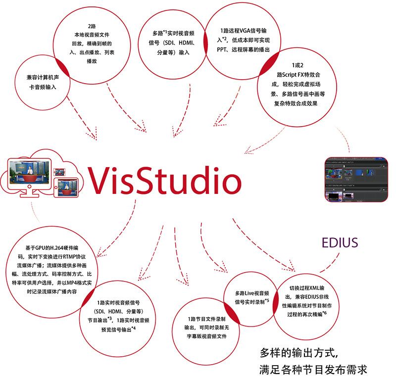 VisStudio多路視音頻切換錄制系統是一款基于Windows 64Bit計算平臺的廣播級視音頻切換系統,集多路視音頻信號切換、調音臺、多路本地或遠程字幕疊加、臺標角標疊加、節目輸入輸出錄制、節目輸出流媒體廣播、視頻摳像、虛擬場景合成等多種功能于一身,使得一套設備就能替代原來演播室內多種傳統設備相互連接協作才能完成的功能。可廣泛適用于節目現場直播、文藝晚會、專題訪談、體育轉播、課件錄制、婚慶錄像等多種場合。
