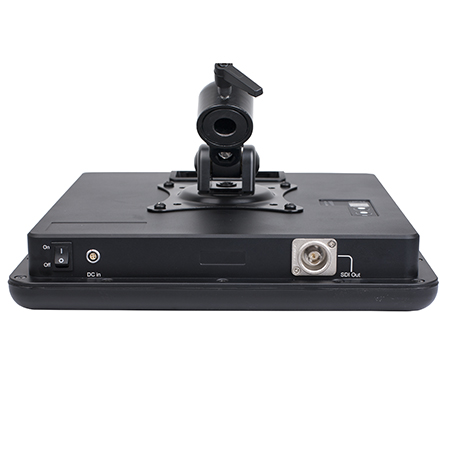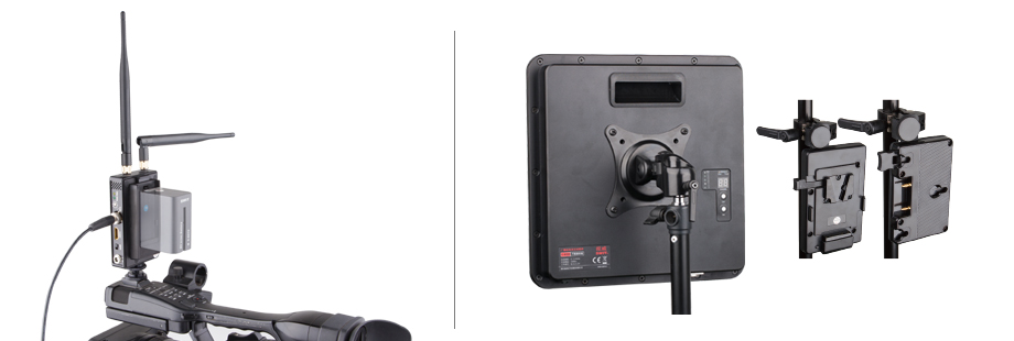 接收端:標配VESA支架可架設在燈光腳架上,采用4-pin LEMO DC-IN插口供電,電影級輸入電壓范圍7-36V,配備鉗夾式V字型或安頓型扣板,可安裝在燈光腳架上供電。