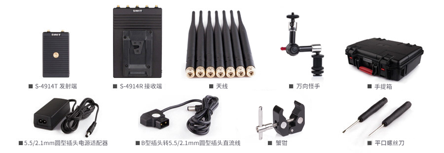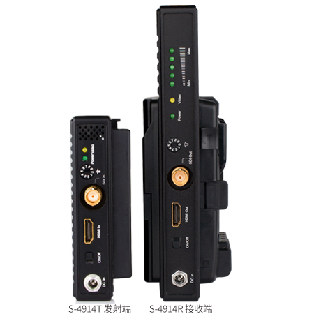 接收端S-4914R配有V字型或安頓型扣板,用于電池供電。 發(fā)射端和接收端皆可通過5.5/2.1mm 圓形DC接口供電,電壓在6.5V-17V范圍內(nèi)。