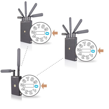 無線傳輸有0-9個頻段通道,使用時用戶可撥碼配對。在同一地點使用時,為了防止設(shè)備間互相干擾,我們建議: