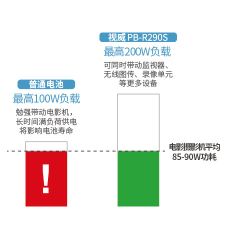 普通鋰電池一般不高于支持100W/8A持續輸出,雖然適合大部分ENG攝像機,但是大功率的電影攝像機(如ALEXA ,需要大約85W 帶載能力)長時間使用普通鋰電池滿負荷帶載,會因為負載太重而影響電池壽命。如果監視器和燈光同時工作,總負載會在100W左右,普通鋰電池無法完全帶載。而PB-R290S高負載鋰電池較高持續帶載200W/16A,不僅可以輕松帶載高功率電影攝像機,同時還能給燈光和其他設備供電,保持長時間高功率輸出并且不影響電池壽命。