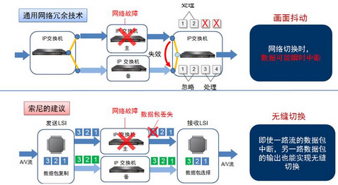 索尼IP LIVE系統具有真正的系統冗余備份,系統中任何一個設備端口全部是雙網口,并通過雙交換機,雙網絡管理服務器,實現真正的IP雙網結構,真正實現同步、視頻、音頻等信號的無縫倒換,保證直播的高安全性和高可靠性。